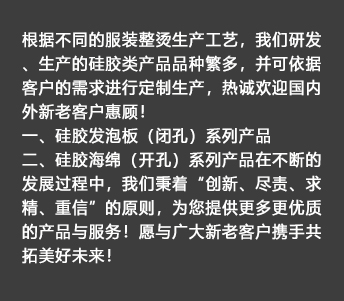 我公司生產(chǎn)的硅膠海綿(開孔)系列產(chǎn)品具有耐高溫、透氣性好、耐壓性強等優(yōu)點,是西服及高檔服裝整燙生產(chǎn)的必備產(chǎn)品。硅膠發(fā)泡板(閉孔)系列產(chǎn)品具有發(fā)泡均勻,耐高溫、耐壓性能好,其中新研制開發(fā)的針孔浮點硅膠發(fā)泡板攻克了一般產(chǎn)品的浮點不飽滿的技術(shù)難題,一般產(chǎn)品的浮點不飽滿,容易擋住透氣孔,造成吸風(fēng)效果不良。我司的產(chǎn)品具有更好的透氣性和回彈性,以及更長時間的試用壽命。